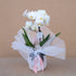 Tek dal midi beyaz orkide, şeffaf orkide saksısı ve saksı altlığı ile satılır. Özel kağıtlarla dekoratif bir şekilde sarılır ve sulamaya uygundur.