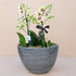 Oval gri seramik vazoda iki ayrı kök sarı orkide.
